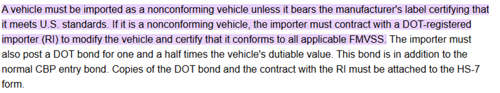 You will be required to work alongside a DOT-registered importer or RI in order to legally import that car when the vehicle is non-conforming or non-compliant. It does not conform when lacking a manufacturer’s label which certifies that it meets US standards.